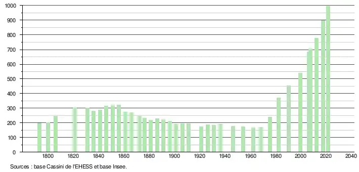 L'évolution du nombre d'habitants est connue à travers les recensements de la population effectués dans la commune depuis 1793. Pour les communes de moins de 10 000 habitants, une enquête de recensement portant sur toute la population est réalisée tous les cinq ans, les populations légales des années intermédiaires étant quant à elles estimées par interpolation ou extrapolation[30]. Pour la commune, le premier recensement exhaustif entrant dans le cadre du nouveau dispositif a été réalisé en 2007[31].