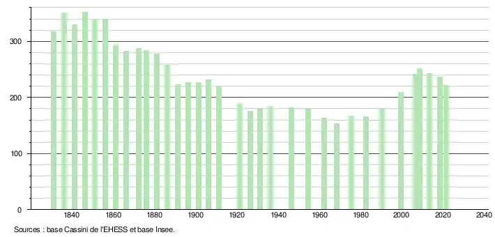 L'évolution du nombre d'habitants est connue à travers les recensements de la population effectués dans la commune depuis 1831. Pour les communes de moins de 10 000 habitants, une enquête de recensement portant sur toute la population est réalisée tous les cinq ans, les populations légales des années intermédiaires étant quant à elles estimées par interpolation ou extrapolation[36]. Pour la commune, le premier recensement exhaustif entrant dans le cadre du nouveau dispositif a été réalisé en 2008[37].