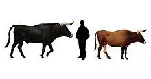 L'aurochs[n 1] (ou auroch[1],[n 2]) est une espèce de bovidé, ancêtre des races actuelles de bovins domestiques et dont la descendance sauvage est désormais éteinte. Appartenant au genre Bos, son nom scientifique est Bos primigenius ou Bos taurus primigenius selon les auteurs. Il est également désigné parfois par les noms d'urus ou ure. Menacé par la chasse, les croisements (pollution génétique) et la domestication, la forme sauvage de l'aurochs n'existait plus qu'en Europe de l'Est à partir du XIIIe siècle, avant de s'éteindre dans la première moitié du XVIIe siècle (le dernier spécimen est mort en 1627 dans la forêt de Jaktorow en Pologne). Entre sa domestication et la disparition de sa forme sauvage, les croisements étaient réguliers en Europe[2], notamment par la capture d'aurochs femelles[3].