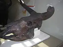 Le crâne était volumineux, avec un front plat et étroit muni de grandes cornes en forme de lyre, tournées vers l'avant en faisant un angle d'environ soixante degrés avec le front. La pointe pouvait parfois remonter vers le haut[33]. La forme précise de ces cornes pouvait légèrement varier d'un individu à l'autre. Celles des mâles pouvaient aller jusqu'à cent sept centimètres de longueur[34], quand celles des femelles étaient plus petites, jusqu'à soixante dix centimètres de longueur[30]. Claude Guintard indique même une taille maximale pour les mâles de cent vingt centimètres, mais des tailles moyennes bien inférieures à ces maximums : soixante deux centimètres pour les mâles, et quarante deux pour les femelles[35].