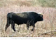 Un aurochs de Heck mâle. La couleur du corps et l'orientation des cornes ressemblent à celles de son ancêtre, mais la forme et la taille des cornes diffèrent. Cet animal est également plus petit.