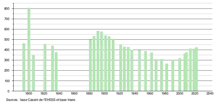 L'évolution du nombre d'habitants est connue à travers les recensements de la population effectués dans la commune depuis 1793. Pour les communes de moins de 10 000 habitants, une enquête de recensement portant sur toute la population est réalisée tous les cinq ans, les populations légales des années intermédiaires étant quant à elles estimées par interpolation ou extrapolation[21]. Pour la commune, le premier recensement exhaustif entrant dans le cadre du nouveau dispositif a été réalisé en 2008[22].