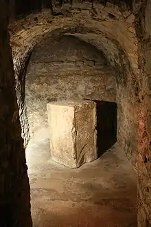 Le corps d’Auspice aurait été enseveli par des premiers chrétiens - dont peut-être Corilius - dans la cavité souterraine où l’évêque déposa le corps de sainte Anne dans une châsse en cyprès. Situé entre l’amphithéâtre et le forum, le lieu servait aussi de petite chapelle ou le premier apôtre de la cité avait coutume d’effectuer les sacrements de l’eucharistie et du baptême. C’est à cet endroit que fut plus tard érigé l’église cathédrale, construite dit-on avec des pierres de l’amphithéâtre démoli. Les noms qui furent donné à cet endroit sont Antrum Antiquum comme caveau ou Sepulchra Sanctorum comme sépulture. Celle-ci fut ensuite murée pour la protéger des répressions et des pillages, puis délaissée et oubliée.