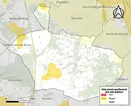 Le retrait-gonflement des sols argileux est susceptible d'engendrer des dommages importants aux bâtiments en cas d’alternance de périodes de sécheresse et de pluie. 5,4 % de la superficie communale est en aléa moyen ou fort (67,4 % au niveau départemental et 48,5 % au niveau national). Sur les 270 bâtiments dénombrés sur la commune en 2019, 1 sont en aléa moyen ou fort, soit 0 %, à comparer aux 81 % au niveau départemental et 54 % au niveau national. Une cartographie de l'exposition du territoire national au retrait gonflement des sols argileux est disponible sur le site du BRGM[19],[Carte 3].