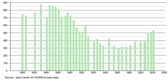 L'évolution du nombre d'habitants est connue à travers les recensements de la population effectués dans la commune depuis 1800. Pour les communes de moins de 10 000 habitants, une enquête de recensement portant sur toute la population est réalisée tous les cinq ans, les populations légales des années intermédiaires étant quant à elles estimées par interpolation ou extrapolation[31]. Pour la commune, le premier recensement exhaustif entrant dans le cadre du nouveau dispositif a été réalisé en 2007[32].