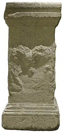 La face principale porte une tête de taureau en bas-relief, avec les bandelettes rituelles retombant de chaque côté (bucranium vittatum), en assez mauvais état, vraisemblablement martelé à une époque inconnue. Au-dessus est gravé le texte suivant (CIL XII, 1744) :
