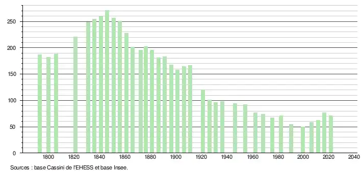 L'évolution du nombre d'habitants est connue à travers les recensements de la population effectués dans la commune depuis 1793. Pour les communes de moins de 10 000 habitants, une enquête de recensement portant sur toute la population est réalisée tous les cinq ans, les populations légales des années intermédiaires étant quant à elles estimées par interpolation ou extrapolation[31]. Pour la commune, le premier recensement exhaustif entrant dans le cadre du nouveau dispositif a été réalisé en 2006[32].