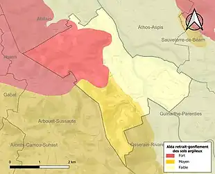 Le retrait-gonflement des sols argileux est susceptible d'engendrer des dommages importants aux bâtiments en cas d’alternance de périodes de sécheresse et de pluie[35]. 57,7 % de la superficie communale est en aléa moyen ou fort (59 % au niveau départemental et 48,5 % au niveau national)[Carte 5]. Depuis le , en application de la loi ELAN, différentes contraintes s'imposent aux vendeurs, maîtres d'ouvrages ou constructeurs de biens situés dans une zone classée en aléa moyen ou fort[Note 6],[36].