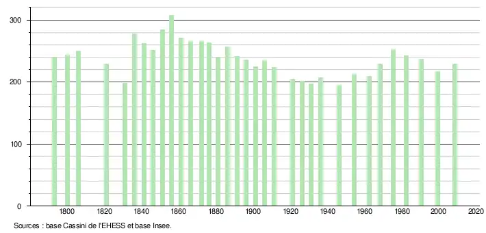 L'évolution du nombre d'habitants est connue à travers les recensements de la population effectués dans la commune depuis 1793. À partir du , les populations légales des communes sont publiées annuellement dans le cadre d'un recensement qui repose désormais sur une collecte d'information annuelle, concernant successivement tous les territoires communaux au cours d'une période de cinq ans. Pour les communes de moins de 10 000 habitants, une enquête de recensement portant sur toute la population est réalisée tous les cinq ans, les populations légales des années intermédiaires étant quant à elles estimées par interpolation ou extrapolation[5]. Pour la commune, le premier recensement exhaustif entrant dans le cadre du nouveau dispositif a été réalisé en 2008[6],[Note 1].