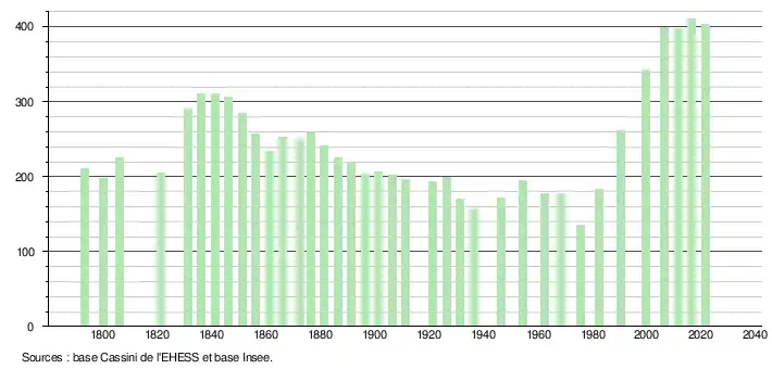 L'évolution du nombre d'habitants est connue à travers les recensements de la population effectués dans la commune depuis 1793. Pour les communes de moins de 10 000 habitants, une enquête de recensement portant sur toute la population est réalisée tous les cinq ans, les populations légales des années intermédiaires étant quant à elles estimées par interpolation ou extrapolation[20]. Pour la commune, le premier recensement exhaustif entrant dans le cadre du nouveau dispositif a été réalisé en 2006[21].