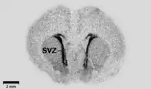 « Autoradiogramme » (ou « autoradiographie ») d'une coupe (coronale) de cerveau embryonnaire de rat. Le marquage radioactif a été fait avec des séquences oligonucléotidiques conjugués avec de l'35S-dATP (désoxyadénosine triphosphate) qui se lie à du GAD67, acide glutamique décarboxylase 67 radiomarqué. Cet acide se montre ici surexprimé dans deux zones situées dans l'espace sous-ventriculaire du cerveau (zones noires correspondant aux niveaux élevés de radioactivité qui ont marqué la pellicule).