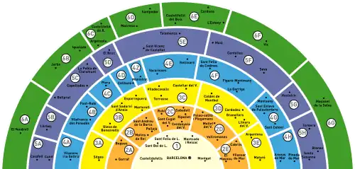 Le réseau ATM est divisé en six zones (de 1 à 6, zone centrale - plusieurs zones périphériques). Le prix du billet ne dépend pas de la région où vous voyagez, à l'exception des zones traversées pendant le voyage. La première couronne est proprement la région métropolitaine de Barcelone et inclut les municipalités de la côte de Castelldefels à Montgat.