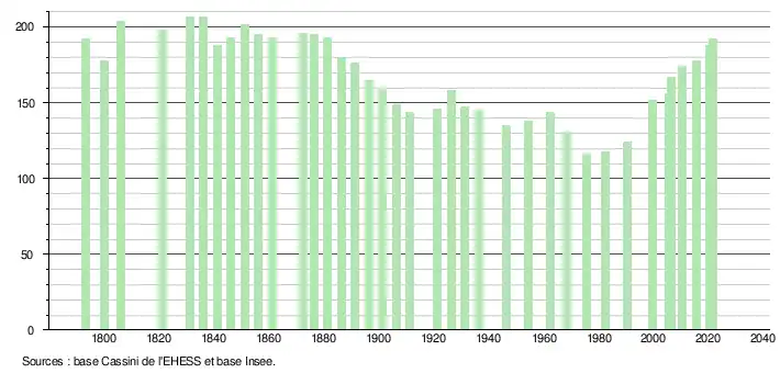 L'évolution du nombre d'habitants est connue à travers les recensements de la population effectués dans la commune depuis 1793. Pour les communes de moins de 10 000 habitants, une enquête de recensement portant sur toute la population est réalisée tous les cinq ans, les populations légales des années intermédiaires étant quant à elles estimées par interpolation ou extrapolation[19]. Pour la commune, le premier recensement exhaustif entrant dans le cadre du nouveau dispositif a été réalisé en 2005[20].