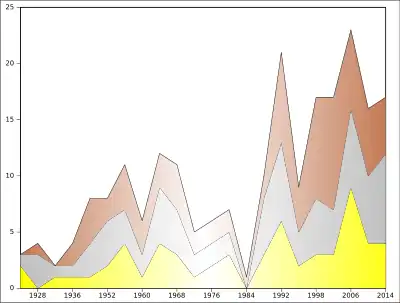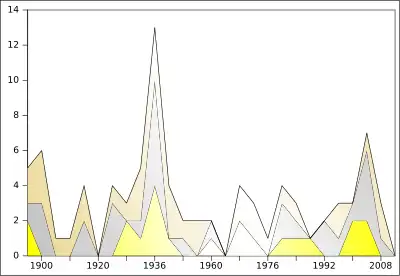 Évolution du nombre de médailles gagnées par l'Autriche aux Jeux olympiques d'été de 1896 à 2012.
