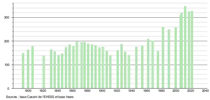 L'évolution du nombre d'habitants est connue à travers les recensements de la population effectués dans la commune depuis 1793. Pour les communes de moins de 10 000 habitants, une enquête de recensement portant sur toute la population est réalisée tous les cinq ans, les populations légales des années intermédiaires étant quant à elles estimées par interpolation ou extrapolation[30]. Pour la commune, le premier recensement exhaustif entrant dans le cadre du nouveau dispositif a été réalisé en 2007[31].
