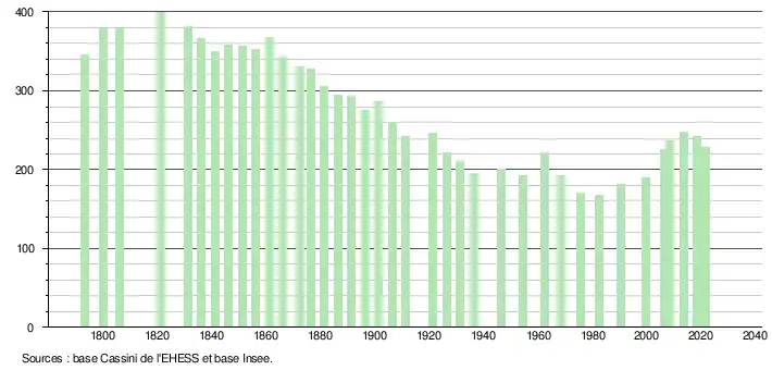 L'évolution du nombre d'habitants est connue à travers les recensements de la population effectués dans la commune depuis 1793. Pour les communes de moins de 10 000 habitants, une enquête de recensement portant sur toute la population est réalisée tous les cinq ans, les populations légales des années intermédiaires étant quant à elles estimées par interpolation ou extrapolation[18]. Pour la commune, le premier recensement exhaustif entrant dans le cadre du nouveau dispositif a été réalisé en 2008[19].