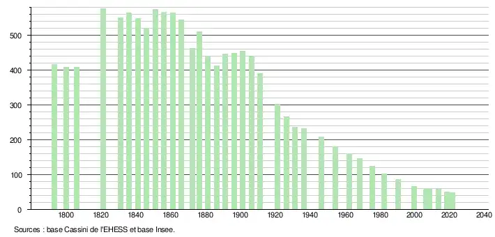 Le nombre d'exploitations agricoles en activité et ayant leur siège dans la commune est passé de 14 en 1988 à un nombre inférieur au secret statistique en 2010[32]. Le même mouvement est observé à l'échelle du département qui a perdu pendant cette période 43 % de ses exploitations[33]. La surface agricole utilisée sur la commune a également diminué.