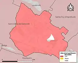 Le retrait-gonflement des sols argileux est susceptible d'engendrer des dommages importants aux bâtiments en cas d’alternance de périodes de sécheresse et de pluie. 98,6 % de la superficie communale est en aléa moyen ou fort (88,8 % au niveau départemental et 48,5 % au niveau national). Sur les 593 bâtiments dénombrés sur la commune en 2019, 592 sont en aléa moyen ou fort, soit 100 %, à comparer aux 98 % au niveau départemental et 54 % au niveau national. Une cartographie de l'exposition du territoire national au retrait gonflement des sols argileux est disponible sur le site du BRGM[25],[Carte 3].