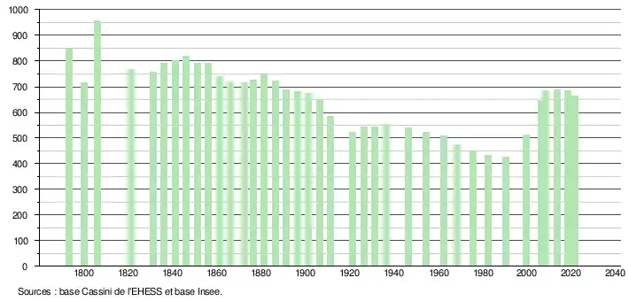 L'évolution du nombre d'habitants est connue à travers les recensements de la population effectués dans la commune depuis 1793. Pour les communes de moins de 10 000 habitants, une enquête de recensement portant sur toute la population est réalisée tous les cinq ans, les populations légales des années intermédiaires étant quant à elles estimées par interpolation ou extrapolation[20]. Pour la commune, le premier recensement exhaustif entrant dans le cadre du nouveau dispositif a été réalisé en 2008[21].