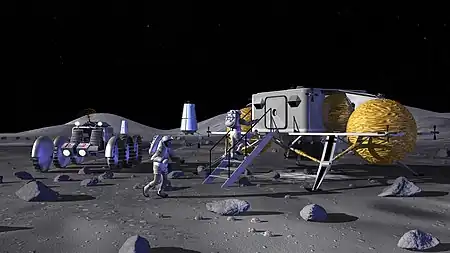 Astronautes entrant dans le module pressurisé de l'avant-poste lunaire (vue d'artiste 2006).