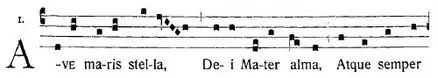 Ave, maris stella, Sumens illud Ave Solve vincla reis, Monstra te esse matrem, Virgo singularis, Vitam præsta puram, Sit laus Deo Patri. |
