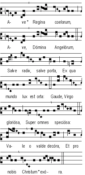 Tout comme les autres antiennes mariales, la composition de ce texte n'est pas nombreuse dans le répertoire de la musique contemporaine. On chante toujours la version traditionnelle en monodie, qui possède cependant une caractéristique moderne. Si cette version adoptait le sixième mode, elle perdit déjà le teneur la ainsi que cette modalité grégorienne avec l'usage du bémol[22]. Cette modernité de composition, qui n'est pas étrange pour les oreilles de nos jours, peut expliquer pourquoi cette antienne traditionnelle est toujours appréciée dans les célébrations.
