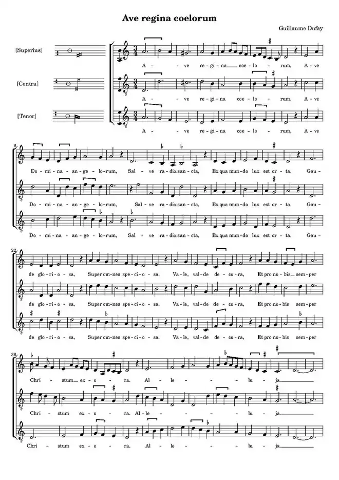 - John Dunstaple (vers 1390 - † 1453) : antienne mariale à 3 voix[27]