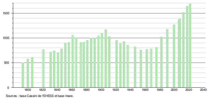 L'évolution du nombre d'habitants est connue à travers les recensements de la population effectués dans la commune depuis 1793. Pour les communes de moins de 10 000 habitants, une enquête de recensement portant sur toute la population est réalisée tous les cinq ans, les populations légales des années intermédiaires étant quant à elles estimées par interpolation ou extrapolation[18]. Pour la commune, le premier recensement exhaustif entrant dans le cadre du nouveau dispositif a été réalisé en 2007[19].