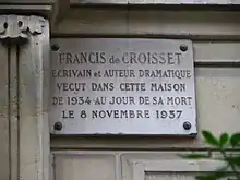 - No 44 : l'écrivain Francis de Croisset est mort le 8 novembre 1937 dans cet immeuble où il vivait depuis 1934 (plaque commémorative).