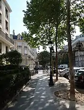- No 6 : hôtel de Joseph Reinach (1856-1921)[1]. Il fut ensuite la résidence du maharajah de Baroda, Sayajî Râo III Gâekwâr (1863-1939), personnage fastueux, qui roulait dans une Rolls-Royce mauve et, selon André Becq de Fouquières « avait pensé faire pressentir les administrateurs de la ville de Paris afin qu'on lui vendît le parc Monceau — et par la même occasion l'ensemble des hôtels qui le bordent[5] ! ». L'édifice accueille de nos jours les classes maternelles et primaires de l'École internationale bilingue.