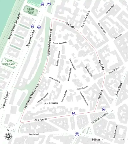 | Début | 93, boulevard de Montmorency et 28, avenue des Peupliers | ||