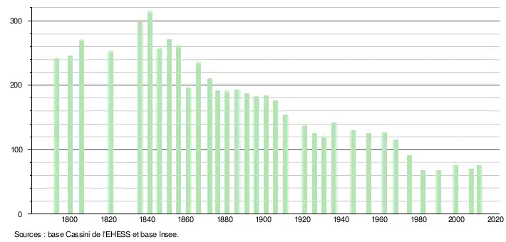 L'évolution du nombre d'habitants est connue à travers les recensements de la population effectués dans la commune depuis 1793. À partir du , les populations légales des communes sont publiées annuellement dans le cadre d'un recensement qui repose désormais sur une collecte d'information annuelle, concernant successivement tous les territoires communaux au cours d'une période de cinq ans. Pour les communes de moins de 10 000 habitants, une enquête de recensement portant sur toute la population est réalisée tous les cinq ans, les populations légales des années intermédiaires étant quant à elles estimées par interpolation ou extrapolation[11]. Pour la commune, le premier recensement exhaustif entrant dans le cadre du nouveau dispositif a été réalisé en 2007[12],[Note 2].