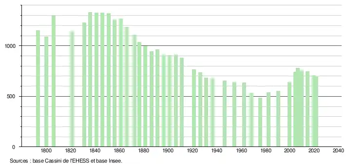 L'évolution du nombre d'habitants est connue à travers les recensements de la population effectués dans la commune depuis 1793. Pour les communes de moins de 10 000 habitants, une enquête de recensement portant sur toute la population est réalisée tous les cinq ans, les populations légales des années intermédiaires étant quant à elles estimées par interpolation ou extrapolation[17]. Pour la commune, le premier recensement exhaustif entrant dans le cadre du nouveau dispositif a été réalisé en 2004[18].