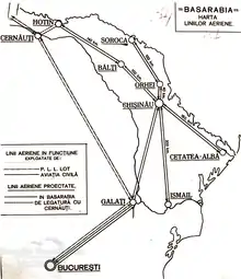 Les premiers vols commerciaux réguliers de transport de passagers ont été assurés par CFRNA (LARES) sur une ligne reliant Bălți à Khotyn et Chișinău entre la première et la deuxième guerres mondiales. L'un des premiers vols spéciaux de transport de passagers à destination de Bălți a eu lieu le 28 octobre (ou le 28 novembre) 1930 et a été organisé par l'administration roumaine de l'aviation civile afin de sélectionner des terrains adaptés aux aérodromes et de faire connaître l'aviation civile au grand public[6].