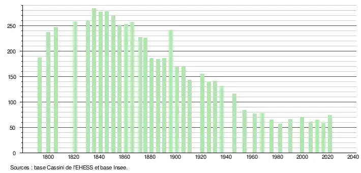 L'évolution du nombre d'habitants est connue à travers les recensements de la population effectués dans la commune depuis 1793. Pour les communes de moins de 10 000 habitants, une enquête de recensement portant sur toute la population est réalisée tous les cinq ans, les populations légales des années intermédiaires étant quant à elles estimées par interpolation ou extrapolation[16]. Pour la commune, le premier recensement exhaustif entrant dans le cadre du nouveau dispositif a été réalisé en 2006[17].