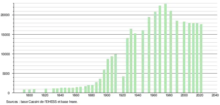 - Par convention dans Wikipédia, le principe a été retenu de n’afficher dans le tableau des recensements et le graphique, pour les populations légales postérieures à 1999, que les populations correspondant à une enquête exhaustive de recensement pour les communes de moins de 10 000 habitants, et que les populations des années 2006, 2011, 2016, etc. pour les communes de plus de 10 000 habitants, ainsi que la dernière population légale publiée par l’Insee pour l'ensemble des communes.