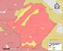 Les mouvements de terrains susceptibles de se produire sur la commune sont des tassements différentiels[16]. Le retrait-gonflement des sols argileux est susceptible d'engendrer des dommages importants aux bâtiments en cas d’alternance de périodes de sécheresse et de pluie[17]. La totalité de la commune est en aléa moyen ou fort (54,9 % au niveau départemental et 48,5 % au niveau national)[Carte 2]. Depuis le , en application de la loi ELAN, différentes contraintes s'imposent aux vendeurs, maîtres d'ouvrages ou constructeurs de biens situés dans une zone classée en aléa moyen ou fort[Note 2],[18].