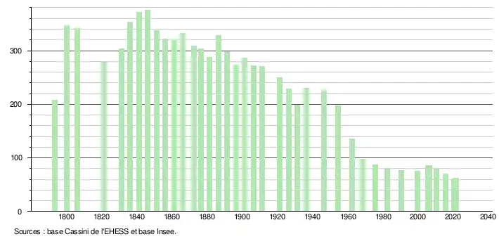 L'évolution du nombre d'habitants est connue à travers les recensements de la population effectués dans la commune depuis 1793. Pour les communes de moins de 10 000 habitants, une enquête de recensement portant sur toute la population est réalisée tous les cinq ans, les populations légales des années intermédiaires étant quant à elles estimées par interpolation ou extrapolation[20]. Pour la commune, le premier recensement exhaustif entrant dans le cadre du nouveau dispositif a été réalisé en 2005[21].