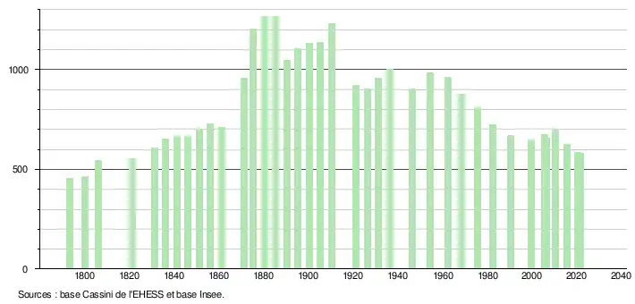 L'évolution du nombre d'habitants est connue à travers les recensements de la population effectués dans la commune depuis 1793. Pour les communes de moins de 10 000 habitants, une enquête de recensement portant sur toute la population est réalisée tous les cinq ans, les populations légales des années intermédiaires étant quant à elles estimées par interpolation ou extrapolation[22]. Pour la commune, le premier recensement exhaustif entrant dans le cadre du nouveau dispositif a été réalisé en 2005[23].