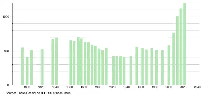 L'évolution du nombre d'habitants est connue à travers les recensements de la population effectués dans la commune depuis 1793. Pour les communes de moins de 10 000 habitants, une enquête de recensement portant sur toute la population est réalisée tous les cinq ans, les populations légales des années intermédiaires étant quant à elles estimées par interpolation ou extrapolation[19]. Pour la commune, le premier recensement exhaustif entrant dans le cadre du nouveau dispositif a été réalisé en 2006[20].