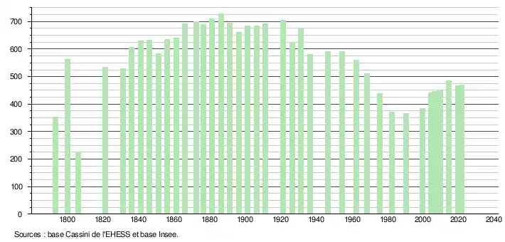 L'évolution du nombre d'habitants est connue à travers les recensements de la population effectués dans la commune depuis 1793. Pour les communes de moins de 10 000 habitants, une enquête de recensement portant sur toute la population est réalisée tous les cinq ans, les populations légales des années intermédiaires étant quant à elles estimées par interpolation ou extrapolation[25]. Pour la commune, le premier recensement exhaustif entrant dans le cadre du nouveau dispositif a été réalisé en 2004[26].