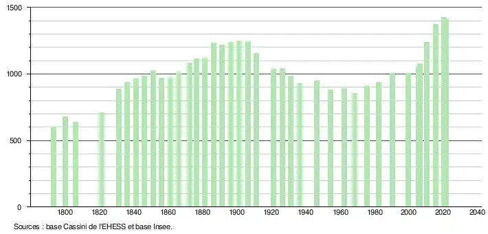 L'évolution du nombre d'habitants est connue à travers les recensements de la population effectués dans la commune depuis 1793. Pour les communes de moins de 10 000 habitants, une enquête de recensement portant sur toute la population est réalisée tous les cinq ans, les populations légales des années intermédiaires étant quant à elles estimées par interpolation ou extrapolation[18]. Pour la commune, le premier recensement exhaustif entrant dans le cadre du nouveau dispositif a été réalisé en 2005[19].