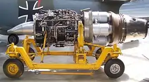 La turbine était faite d'ailettes solides en Inconel[3] attachées à un autre carénage. Elles étaient refroidies par de l'air sous pression prélevé au niveau du cinquième étage du compresseur et transmis par des tuyaux vers l'avant de la turbine. Ces tuyaux étaient installés entre les tubes à flamme. La section de tuyère était faite de feuilles d'acier soudées entre-elles.