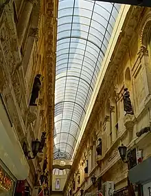 Au départ, l'arcade était éclairée par des lampes à gaz placées devant ses fameux miroirs, donnant ainsi naissance à son autre nom Aynalı Pasaj (Passage aux miroirs). Dans les premières années, les magasins de l'arcade comprenaient un cordonnier, deux coiffeurs, deux tailleurs, une épicerie, un mercier, deux savonniers et un vendeur de tapis. Dans les années suivantes, des entreprises telles que des fleuristes, des horlogers, des fabricants de pianos et des maisons de couture se sont également installées dans le passage[2].