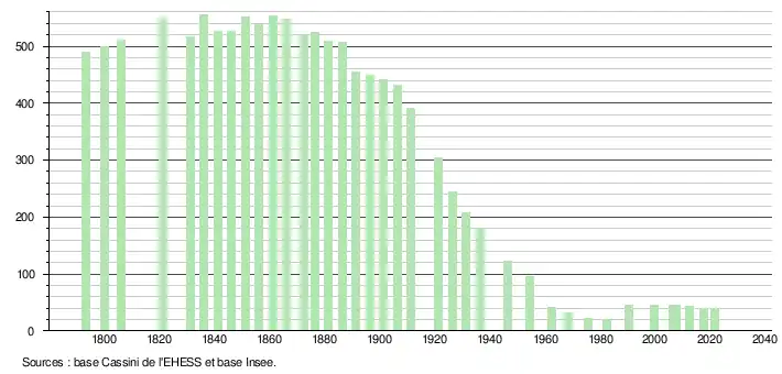 L'évolution du nombre d'habitants est connue à travers les recensements de la population effectués dans la commune depuis 1793. Pour les communes de moins de 10 000 habitants, une enquête de recensement portant sur toute la population est réalisée tous les cinq ans, les populations légales des années intermédiaires étant quant à elles estimées par interpolation ou extrapolation[44]. Pour la commune, le premier recensement exhaustif entrant dans le cadre du nouveau dispositif a été réalisé en 2007[45].