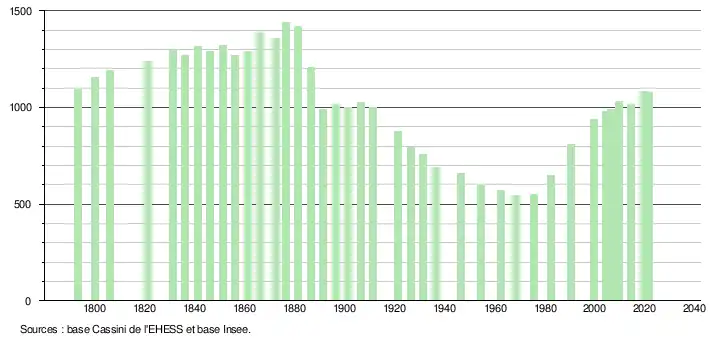 L'évolution du nombre d'habitants est connue à travers les recensements de la population effectués dans la commune depuis 1793. Pour les communes de moins de 10 000 habitants, une enquête de recensement portant sur toute la population est réalisée tous les cinq ans, les populations légales des années intermédiaires étant quant à elles estimées par interpolation ou extrapolation[23]. Pour la commune, le premier recensement exhaustif entrant dans le cadre du nouveau dispositif a été réalisé en 2004[24].