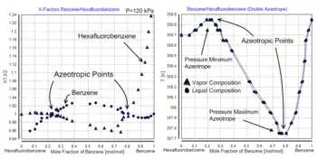 Il ne peut y avoir un point azéotrope dans un diagramme binaire que pour des solutions non idéales (la loi de Raoult est formellement incapable de représenter un azéotrope) de liquides totalement miscibles. Dans ces solutions réelles les interactions entre 2 constituants A et B sont de natures différentes des interactions de type A - A ou de type B - B. Par exemple, à pression atmosphérique, un mélange à 96 % d'éthanol et 4 % d'eau présente un azéotrope qui bout à 78,1 °C[2]. Cette température est inférieure à celle de l'eau pure (100 °C) et celle de l'éthanol pur (78,4 °C). En pratique, une différence de température d'ébullition de 0,3 °C est difficile à exploiter.