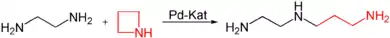 Le cycle de l'azétidine peut être ouvert par des nucléophiles. Ainsi, l'éthylènediamine réagit avec l'azétidine sous l'effet d'un catalyseur au palladium pour donner une triamine[3] :