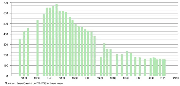 L'évolution du nombre d'habitants est connue à travers les recensements de la population effectués dans la commune depuis 1793. Pour les communes de moins de 10 000 habitants, une enquête de recensement portant sur toute la population est réalisée tous les cinq ans, les populations légales des années intermédiaires étant quant à elles estimées par interpolation ou extrapolation[21]. Pour la commune, le premier recensement exhaustif entrant dans le cadre du nouveau dispositif a été réalisé en 2004[22].