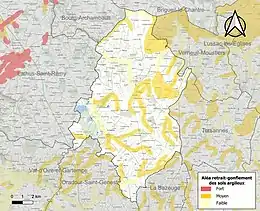 Le retrait-gonflement des sols argileux est susceptible d'engendrer des dommages importants aux bâtiments en cas d'alternance de périodes de sécheresse et de pluie[18]. 22,1 % de la superficie communale est en aléa moyen ou fort (27 % au niveau départemental et 48,5 % au niveau national métropolitain)[Carte 2]. Depuis le , en application de la loi ÉLAN, différentes contraintes s'imposent aux vendeurs, maîtres d'ouvrages ou constructeurs de biens situés dans une zone classée en aléa moyen ou fort[Note 4],[19].